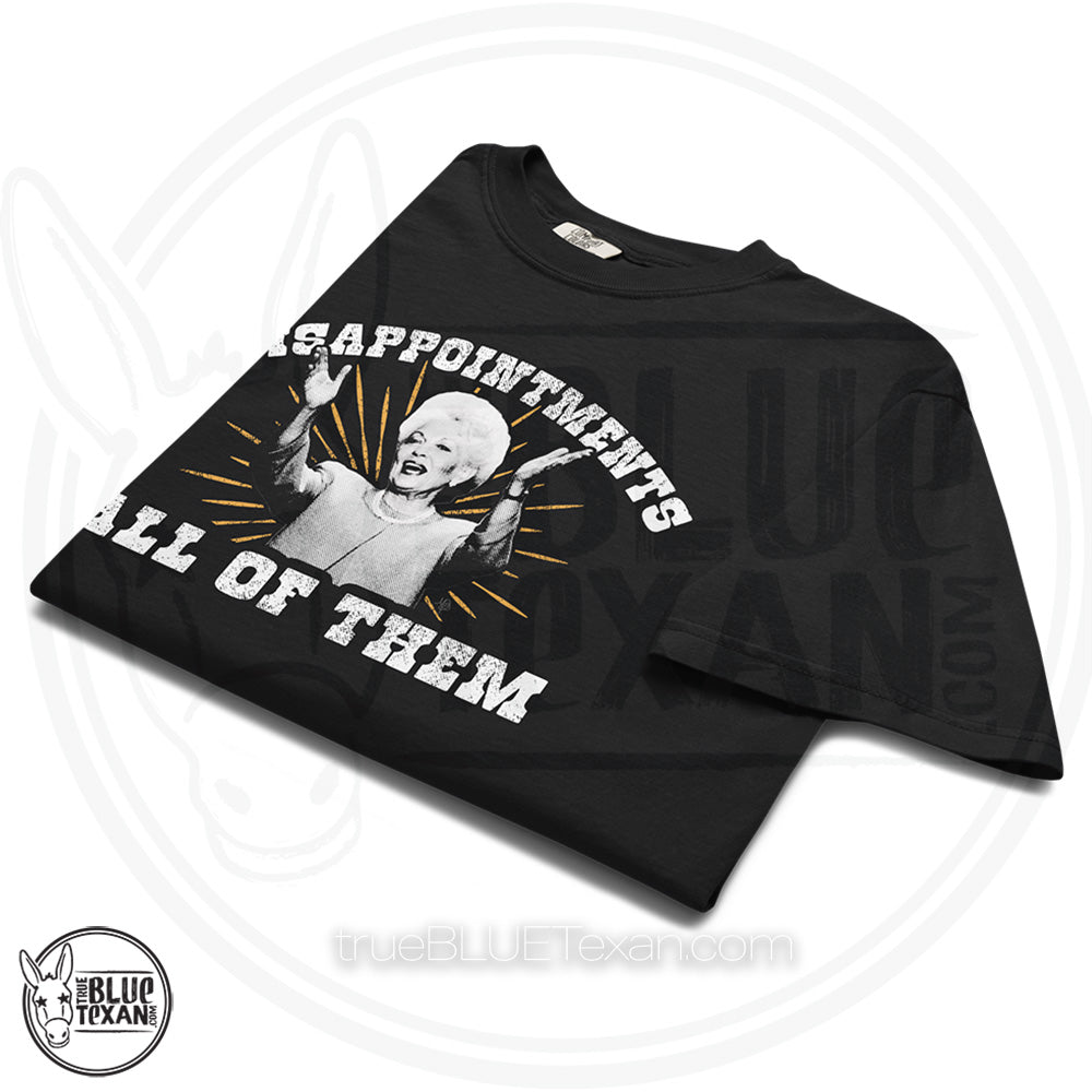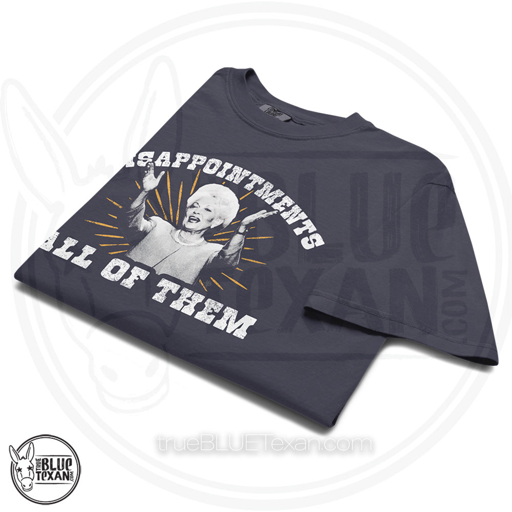 Same great Ann Richards - Disappointments ALL OF THEM design but on a fan favorite classic Comfort Colors Shirt. This is a larger print on a more oversized shirt. Available in Black, Navy and Midnight colors.