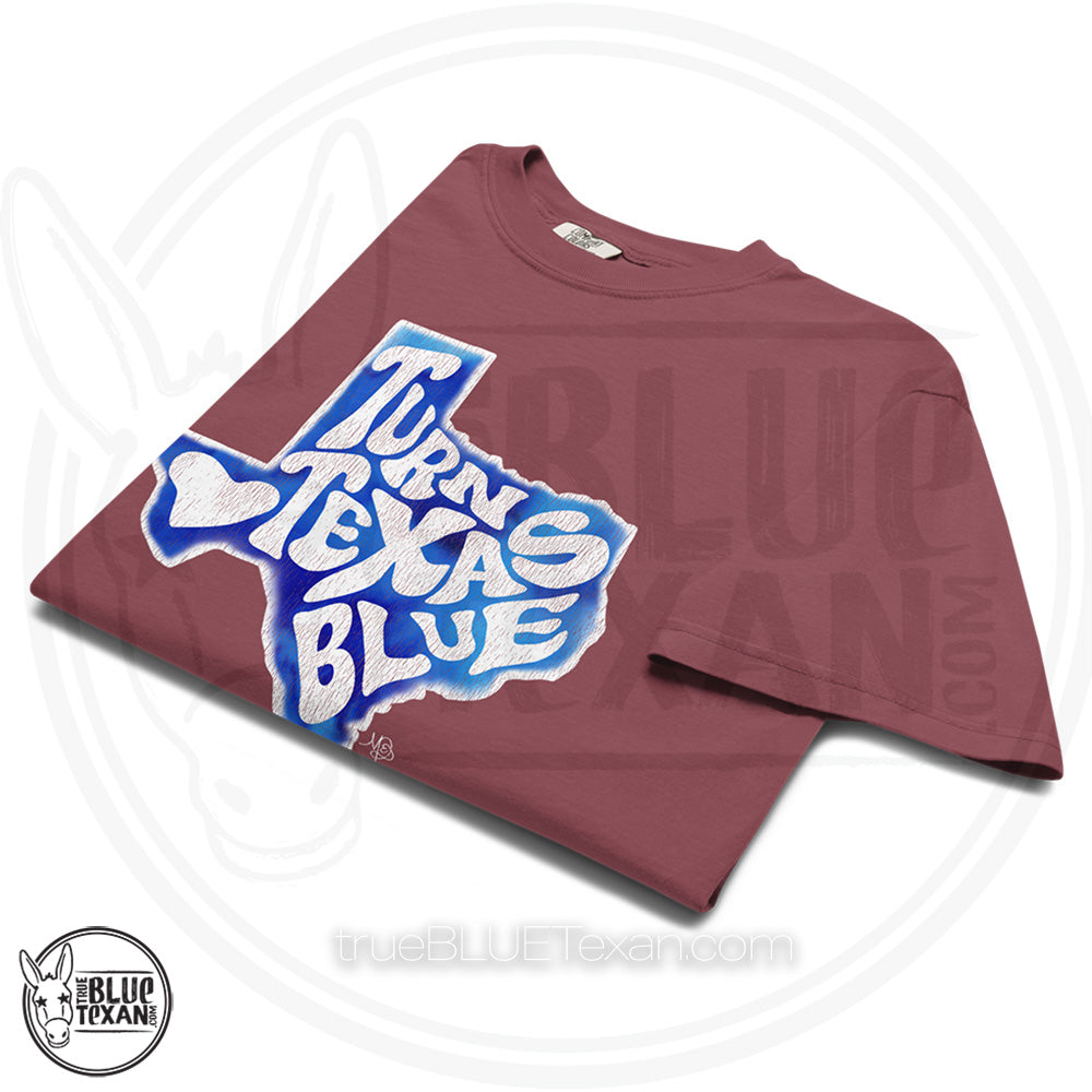 This is a Custom Design for Sun City Democrats with my original digital drawing Turn Texas Blue aged design on the front with their information on the back label. I have reworked my original design using authentic plastisol aged textures so that the graphic has a more vintage look and hand feel to go along with the hand dyed vintage feel of this Comfort Colors classic favorite. It is available in True Navy, Pepper, Brick & Blue Jean. If you would like the shirt without the back label, you can find it here.