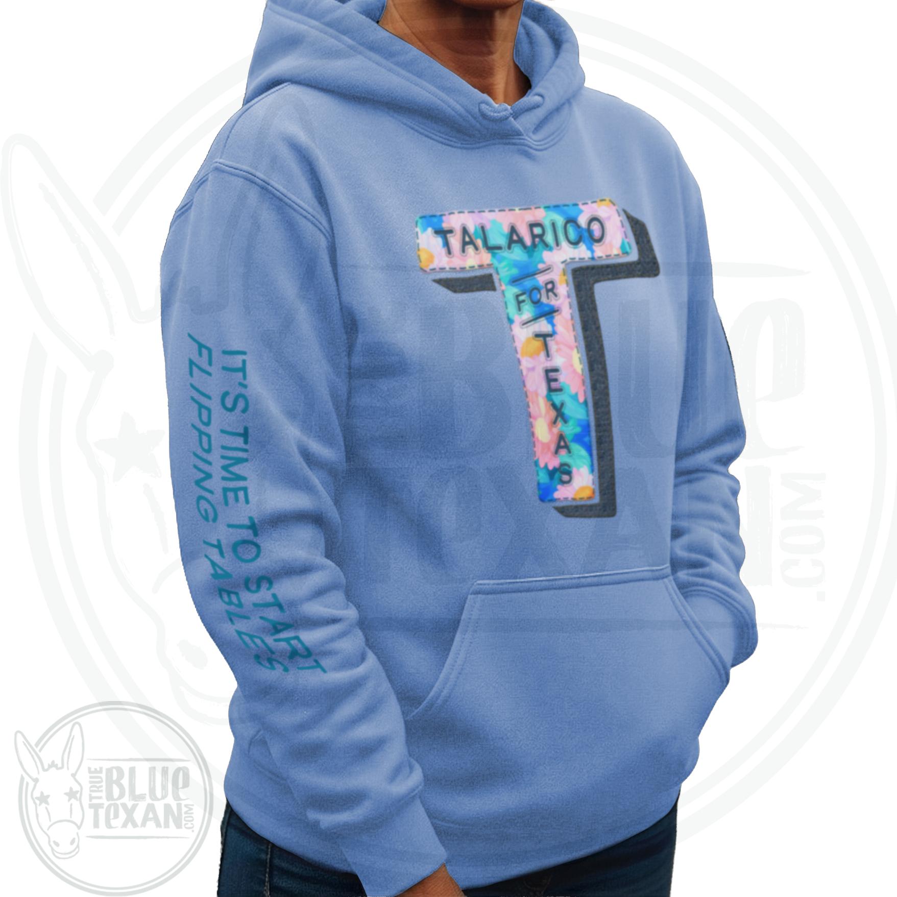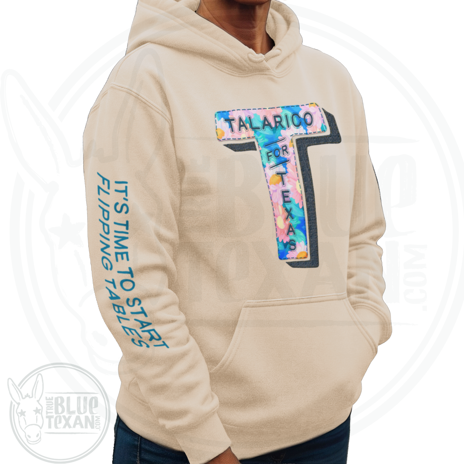 Add some COLOR to your grassroots support of James Talarico for US Senate. This is his official T logo transformed into a faux fabric applique that looks hand embroidered on. Down the right arm are the words "It's time to start flipping tables" in dark teal. This is the Pastel Floral version hoodie (there is also a Comfort Colors matching T Shirt!). There is also a Sunflower and quilted one as well! Lots of texture and interest in the design that makes it something fun.